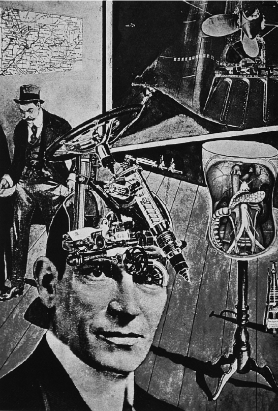 According to Biro, the Dada artists were oftentimes making work about subjects that didn’t even exist yet (Biro, 2007, p. 27). Hunt informs us that the term ‘cyborg’ wasn’t actually part of the Dada artists vocabulary at this point, although it “aptly captures Dadaists reconceptualization of embodiment and the interconnections they saw rapidly emerging between humans and technology” (Hunt, 2015, p. 9). Unbeknownst to Hausmann, these ideas would become vital in the ever-changing climate of rapid technological advancements, and would actually go on to form the basis of what is considered transhumanist ideology today. As defined by Mark O’ Connell in his book To Be A Machine, the transhumanism worldview is a “conception of our minds and bodies as obsolete technologies, outmoded formats in need of complete overhaul” (O’ Connell, 2017, p. 11). Hausmann and his contemporaries explored and experimented with the redesigning of the human body and the ways in which we can actually enact this ‘overhaul’. By taking on this role, the Dadaists can be characterised as “artistic pioneers of an investigation into ‘the self’ and the parallel reconceptualization of human identity in the early 20th century” (Hunt, 2015, p. 8).